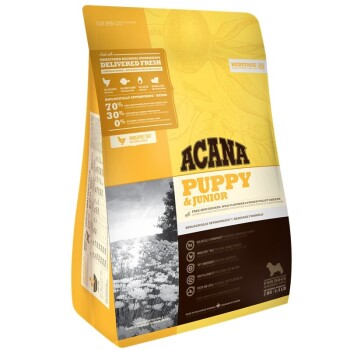 Acana Puppy & Junior ist ein ausgewogenes Futter für Welpen von 9kg bis 25kg. Angelehnt an die natürlichen Ernährungsgewohnheiten heranwachsender Hunde enthalten die Mahlzeiten einen hohen Anteil an Fleisch, ergänzt mit kleinen Mengen Obst und Gemüse – alles aus lokalem Anbau in Kanada.