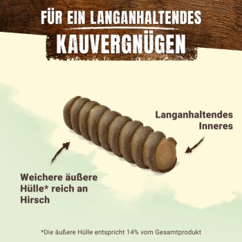 - Die Leckerlis für Hunde besitzen eine schmackhafte, weiche Hülle reich an Hirsch. Ihr Hund wird es lieben, in das leckere Äußere der Kaurolle zu beißen und auf dem langanhaltenden Inneren zu kauen... genau wie er es in freier Wildbahn tun würde.