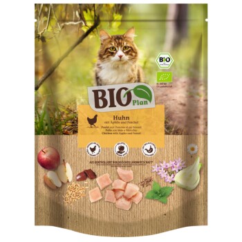 BIOPlan Adult Huhn enthält biologische Zutaten nach EU-Öko-Verordnung 834/2007 und tierische Bestandteile aus kontrolliert biologischer Haltung. Die Nährstoffgehalte sind sorgfältig auf die Bedürfnisse ausgewachsener Katzen abgestimmt. Das Produkt enthält eine ausgewogene Mischung aus leckerem Bio-Huhn, Bio-Gerste, Bio-Hafer und Bio-Äpfeln. Äpfel können mit ihren spezifischen Ballaststoffen zur Stabilisierung der Verdauung beitragen. Zudem enthalten Äpfel wertvolle Vitamine, Mineralien und Kohlenhydrate. Der hohe Anteil an frischem Bio-Huhn ist besonders leicht verdaulich und eine biologisch hochwertige Proteinquelle.