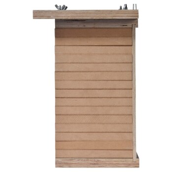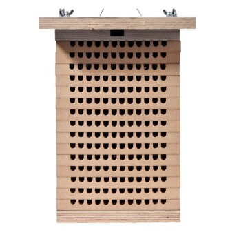 Der Nistblock besteht aus gefrästen Brettern, pro Brett 12 Nistgänge (8mm Durchmesser). Zusammengehalten werden die Nistbretter durch Flügelschrauben. Sie lassen sich zur Kontrolle im Herbst öffnen. Die Konkons können entnommen und Parasiten entfernt werden (optional). Die entnommenen Bienenkonkons werden zum Überwintern in die Mulde unter der Dachplatte gelegt. Im Frühjahr stehen die geschlüpften Bienen wieder als Bestäuber zur Verfügung und können die gesäuberten Nistbretter direkt für die Eiablage nutzen. Der Nistblock bietet Gelegenheit, den Lebenszyklus der Bienen ganz aus der Nähe zu beobachten.