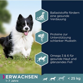 Mit einem Futter, das dem Bedarf Ihres Hundes rundum gerecht wird, kann dieser sein aktives Leben genießen. Dieses speziell auf die Lebensphase und Rasse abgestimmte Futter ist reich an frischem Lamm und Reis. Dadurch ist es leicht verdaulich und besonders für Hunde mit empfindlichem Magen geeignet. Die verbesserte Rezeptur überzeugt aber nicht nur geschmacklich, sondern ist zu 100% komplett und ausgewogen.
