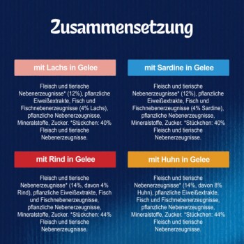 Jede Sorte, speziell für Katzen ab einem Alter von 7 Jahren entwickelt und hergestellt mit hochwertigen Zutaten, besteht aus zarten Stücken in Gelee für eine leckere Mahlzeit, die Ihre Katze lieben wird! Unser Nassfutter für Katzen ab 7+ ist in einer großen Auswahl leckerer Sorten in saftigem Gelee erhältlich, um Ihrer Katze jeden Tag die Abwechslung zu geben, die sie liebt! Sie schmecken wirklich so gut, wie sie aussehen!