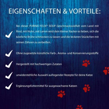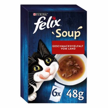 FELIX Soup ist eine unwiderstehliche Auswahl aufregender Rezepte für Ihre Katze. Ihr kleiner Racker wird es lieben, sich die köstliche Brühe schmecken zu lassen und die leckeren Stückchen mit seinen Zähnen zu zerbeißen. Jeder servierfertige Beutel mit FELIX Soup hat die perfekte Größe, um Ihre Katze zu jeder Tageszeit für neuen Unfug zu stärken. Sie können es mit einem guten Gefühl füttern, denn der schmackhafte Katzensnack ist ohne Zusatz von künstlichen Farb-, Aroma- oder Konservierungsstoffen. Bereiten Sie Ihrer Katze jeden Tag eine köstliche Abwechslung mit der unwiderstehlichen Auswahl von FELIX Soup, die perfekte Ergänzung zu den normalen Trocken- oder Nassfutter Ihrer Katze.