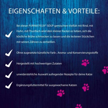 FELIX Soup ist eine unwiderstehliche Auswahl aufregender Rezepte für Ihre Katze. Ihr kleiner Racker wird es lieben, sich die köstliche Brühe schmecken zu lassen und die leckeren Stückchen mit seinen Zähnen zu zerbeißen. Jeder servierfertige Beutel mit FELIX Soup hat die perfekte Größe, um Ihre Katze zu jeder Tageszeit für neuen Unfug zu stärken. Sie können es mit einem guten Gefühl füttern, denn der schmackhafte Katzensnack ist ohne Zusatz von künstlichen Farb-, Aroma- oder Konservierungsstoffen. Bereiten Sie Ihrer Katze jeden Tag eine köstliche Abwechslung mit der unwiderstehlichen Auswahl von FELIX Soup, die perfekte Ergänzung zu den normalen Trocken- oder Nassfutter Ihrer Katze.