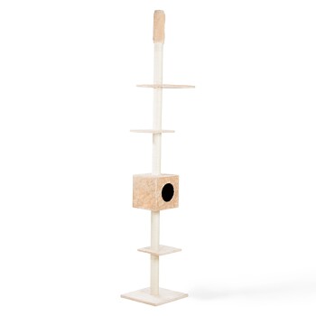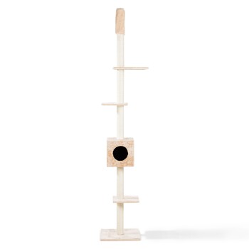 Der Deckenspanner ist aufgrund seiner Größe sehr platzsparend. Die Höhe des Deckenspanners ist zudem verstellbar von 2,40 m auf bis zu 2,60 m. Er bietet zahlreiche mit Plüsch bezogene Sitz- und Liegeflächen zum Relaxen und Beobachten. Die integrierte Höhle gibt Ihrer Samtpfote die Möglichkeit, sich zurückzuziehen.