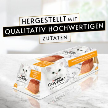 Wir stellen Ihnen GOURMET Revelations vor. Eine erlesene Auswahl vortrefflicher Köstlichkeiten, perfekt geformt, um Ihnen und Ihrer Samtpfote einen exquisiten Genussmoment zu offenbaren. Jede delikate und feine Mousse wird mit qualitativ hochwertigen Zutaten hergestellt und mit einer köstlichen Sauce überzogen, um Ihrer Katze ein exquisites kulinarisches Genusserlebnis zu bieten.