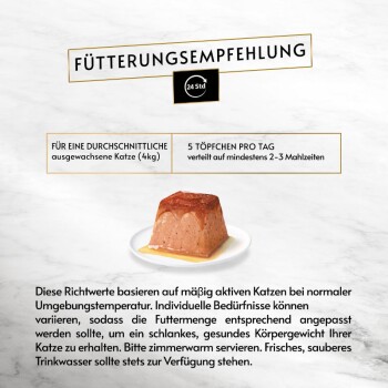 Füttern Sie Ihrer ausgewachsenen Katze (4kg) 5 Töpfchen pro Tag, die auf mindestens 2 bis 3 Mahlzeiten verteilt werden sollten. Diese Richtwerte basieren auf mäβig aktiven Katzen bei normaler Umgebungstemperatur. Individuelle Bedürfnisse können variieren, sodass die Futtermenge entsprechend angepasst werden sollte, um ein schlankes, gesundes Körpergewicht Ihrer Katze zu erhalten. Bitte zimmerwarm servieren. Frisches, sauberes Trinkwasser sollte stets zur Verfügung stehen.