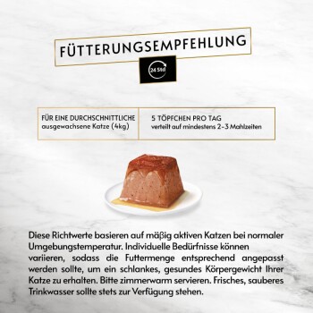 Füttern Sie Ihrer ausgewachsenen Katze (4kg) 5 Töpfchen pro Tag, die auf mindestens 2 bis 3 Mahlzeiten verteilt werden sollten. Diese Richtwerte basieren auf mäβig aktiven Katzen bei normaler Umgebungstemperatur. Individuelle Bedürfnisse können variieren, sodass die Futtermenge entsprechend angepasst werden sollte, um ein schlankes, gesundes Körpergewicht Ihrer Katze zu erhalten. Bitte zimmerwarm servieren. Frisches, sauberes Trinkwasser sollte stets zur Verfügung stehen.