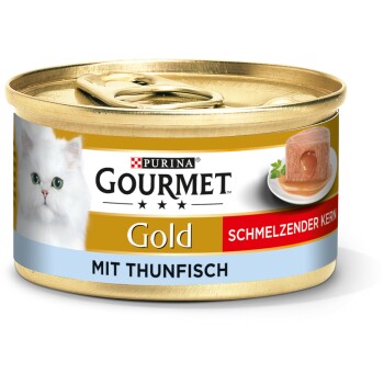 GOURMET Gold - Schmelzender Kern ist eine zarte und unwiderstehliche Pastete exquisiter Geschmacksrichtungen mit einem überraschend schmelzenden Kern. Ihre Katze wird erst in die feine und köstliche Pastete beißen und dann den unerwarteten Kern aus saftiger Sauce entdecken, den Ihre Katze lieben wird.