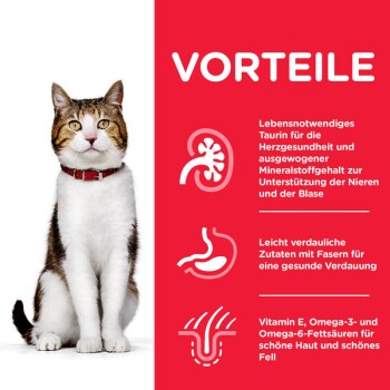 - Vitamin E und Omega-6-Fettsäuren: sorgen für gesunde Haut und gesundes Fell bei Ihrer erwachsenen Katze