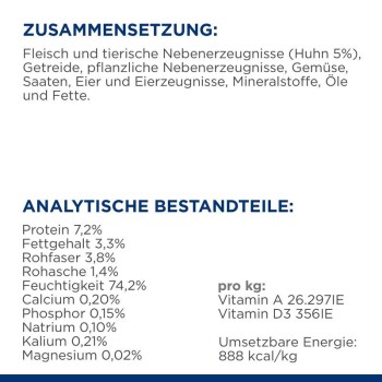 Rohfaser 0,6%, Kohlenhydrate 15,2%, Kalzium 0,19%, Phosphor 0.14%, Magnesium 0, 02%, Beta-Carotin 0,4 mg/kg, Feuchtigkeit 74, 0%, Kalium 0, 22%, L-Carnitin 104,0 mg/kg, Natrium 0,1%, Omega-3 Fettsäure 0, 21%, Omega-6 Fettsäure 0, 68%, Taurin 358.0 mg/kg, Vitamin A 12589.0 IE/kg, Vitamin C (Ascorbinsäure) 25.0 mg/kg, Vitamin D 106.0 IE/kg, Vitamin E (Tocopherole) 130.0 mg/kg