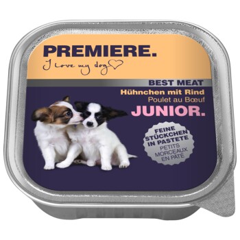Mit feinsten Stückchen in leckerer Pastete werden auch die anspruchsvollen Feinschmecker verwöhnt. PREMIERE Best Meat Junior ist speziell auf die Bedürfnisse der kleinen Hunde angepasst.