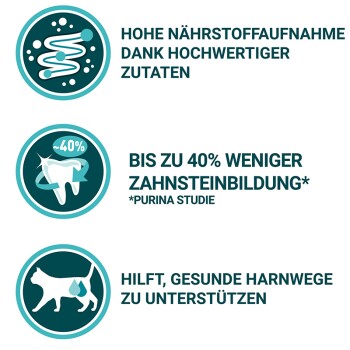 Die qualitativ hochwertigen Zutaten in unseren Premium Katzenfutter sorgen für eine hohe Nährstoffaufnahme, die eine gesunde Verdauung fördern. Gleichzeitig unterstützt die Rezeptur die Zahngesundheit und reduziert nachweislich die Bildung von Zahnbelag um 40% (lt. PURINA Studie).