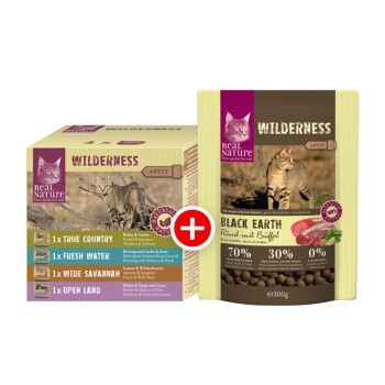 Das leckere Premium Mixpaket besteht außerdem aus der REAL NATURE WILDERNESS Nassnahrung. REAL NATURE WILDERNESS Nassnahrung bietet Ihrer Katze eine an der Ernährung der Vorfahren, der Wildkatze, orientierte, natürliche und getreidefreie Nassnahrung mit hohem Fleischanteil und sorgen für mehr Abwechslung im Napf.