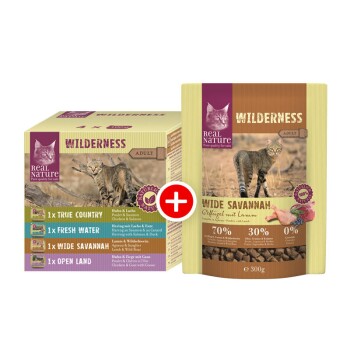 Die Bestandteile des REAL NATURE WILDERNESS Adult Mischfütterungsset im Überblick:- 1x REAL NATURE WILDERNESS Adult Wide Savannah Geflügel mit Lamm 300g Trockenbeutel