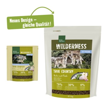REAL NATURE WILDERNESS folgt der Natur Ihres Hundes. Es orientiert sich an der Ernährung des Wolfes als Vorfahr des Hundes und ermöglicht Ihnen, Ihr Tier so artgerecht wie möglich zu ernähren. REAL NATURE WILDERNESS besteht aus 70% hochwertigem Huhn und / oder Fisch, 30% Obst, Gemüse und Kräutern und 0% Getreide. Enthält Kartoffeln als einzige Kohlenhydratquelle und frisches Hühnerfleisch als hochwertige tierische Proteinquelle. Wertvolles Lachsöl ergänzt die REAL NATURE WILDERNESS Rezepturen sinnvoll, indem es essentielle Fettsäuren liefert. REAL NATURE WILDERNESS ist 100% natürlich1 und frei von Konservierungs-, Aroma- und Farbstoffen. Die Junior Rezeptur ist optimal auf den Bedarf des jungen Hundes abgestimmt.