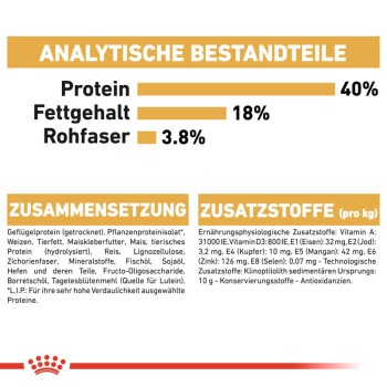 Protein: 40%, Fettgehalt 18%, Rohfaser 3,8%, Rohasche 7,7%