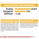 Protein: 25,5%; Fett: 17%; Rohfaser: 1,4%; Rohasche: 5,3%; NFE: 41,3%