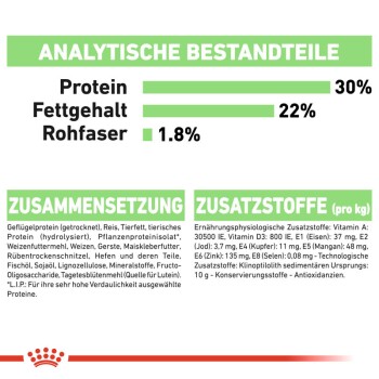 Porteine sind ein sehr wichtiger Betsandteil der Eränhrung von Hunden. Deshalb werden für Royal Canin-Futter die hochwertigsten Proteine verwendet und die Proteinquellen an die exakten Bedürfnisse Ihres Hundes angepasst. Deswegen beinhaltet die Rezeptur von Royal Canin Digestive Care Mini sehr hoch verdauliche Proteine (sogenannte L.I.Ps).