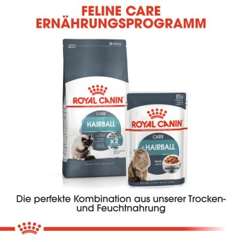 ROYAL CANIN Hairball Care in Soße wurde speziell entwickelt, um Katzen zu helfen, die aufgenommenen Haare zu entfernen. Dies geschieht, indem das Futter den Darmtransit unterstützt und so dazu beiträgt, dass überschüssiges Haar auf natürlichem Wege entfernt wird, welches ansonsten im Magen verbleiben und zu Haarballen führen würde.