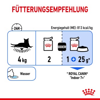 Royal Canin Indoor 7+ Sterilised ist ein Alleinfütterungsmittel (kein Zufüttern nötig). Stellen Sie Ihrer Katze immer frisches Trinkwasser bereit. Achten Sie bei der Nahrungsumstellung darauf, das bisherige Futter allmählich durch Royal Canin Indoor 7+ Sterilised zu ersetzen (über ca. eine Woche). So sorgen Sie für optimale Verträglichkeit und Akzeptanz auch während der Umstellungsphase.