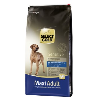 SELECT GOLD Sensitive Adult Maxi ist eine speziell entwickelte, ausgewogene Premium-Trockennahrung für große ausgewachsene Hunde (Gewicht ab 25kg) ab dem ca. 15. Lebensmonat (je nach Hundegröße). Diese qualitativ hochwertige Trockennahrung enthält gut bekömmliche Zutaten und eignet sich daher besonders für ernährungssensible Hunde sowie bei Futtermittelunverträglichkeiten. Bei der Entwicklung dieser Premium-Rezeptur wurden die ernährungsphysiologischen Anforderungen von ausgewachsenen großen Hunden gezielt berücksichtigt.
