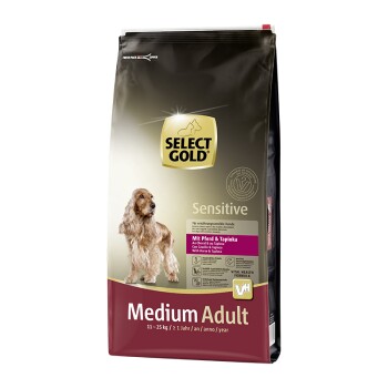 SELECT Gold Sensitive Medium Adult mit Pferd & Tapioka ist eine speziell entwickelte, ausgewogene Premium-Trockennahrung für mittelgroße ausgewachsene Hunde (Gewicht 11-25kg) ab dem ca. 12. Lebensmonat. Diese qualitativ hochwertige Trockennahrung enthält gut bekömmliche Zutaten und eignet sich daher besonders für ernährungssensible Hunde sowie bei Futtermittelunverträglichkeiten. Bei der Entwicklung dieser Premium-Rezeptur wurden die ernährungsphysiologischen Anforderungen von ausgewachsenen mittelgroßen Hunden gezielt berücksichtigt.