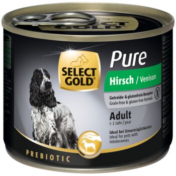SELECT GOLD Pure Premium-Nassnahrung ist optimal geeignet für empfindliche Hunde, die zu Futtermittelunverträglichkeiten oder sehr sensibler Verdauung neigen.