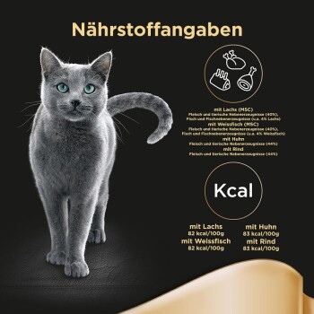 Katzen sind echte Feinschmecker und haben das Bedürfnis nach Abwechslung. Bieten Sie daher Ihrer Katze eine vollwertige Mahlzeit mit einem ausgewogenen Nährstoffgehalt und vollem Geschmack.