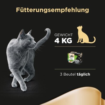 - Eine Katze (4 kg) benötigt 3 Portionsbeutel oder 2 Portionsbeutel und 20 g Trockennahrung täglich.