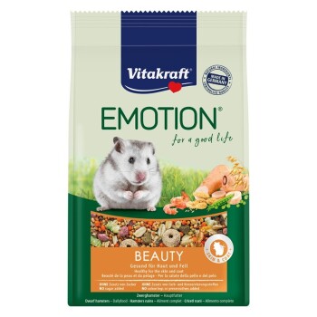 Die ausgewogene Hauptfuttermischung ist in der Auswahl der Zutaten speziell auf die Bedürfnisse von Zwerghamstern ausgerichtet, schmackhafte Shrimps bringen den kleinen Nagern beispielsweise wichtige Proteine. Auch die in der Mischung enthaltenen Futterkörper sind extraklein und damit besonders einfach zu fressen.Wie alle Emotion® Hauptfutter enthält auch Emotion® Beauty Selection selbstverständlich den einzigartigen TriVita®-Complex – das innovative Plus für ein munteres und gesundes Zwerghamsterleben. Von Tierärzten und Nagerexperten entwickelt!+ TriVita®-Complex: Mit DHA aus Meeresalgen enthält Emotion® eine der wertvollsten und biologisch aktivsten Omega-3-Fettsäuren, wichtig für Herztätigkeit, Gehirn und Immunsystem. Prebiotisches Inulin sorgt für eine gesunde Darmflora und fördert eine optimale Verdauung. Das ausgewogene Verhältnis essenzieller Aminosäuren garantiert zudem eine hohe biologische Wertigkeit. Für ein rundum gutes Leben !